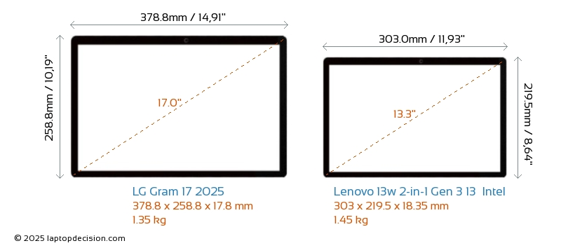 Audio JackBoth Gram 17 2025 and 13w 2-in-1 Gen 3 13 Intel are equipped with a 3.5mm Audio Jack, providing seamless connection to headphones and speakers.