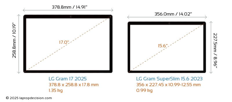 HDMI Gram 17 2025 features an HDMI port (1x HDMI 2.1) for connecting to external monitors. Gram SuperSlim 15.6 2023 does not have an HDMI port.