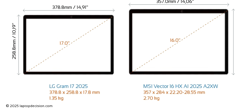 HDMIBoth Gram 17 2025 and Vector 16 HX AI 2025 A2XW feature an HDMI port (1x HDMI 2.1) for connecting to external monitors.
