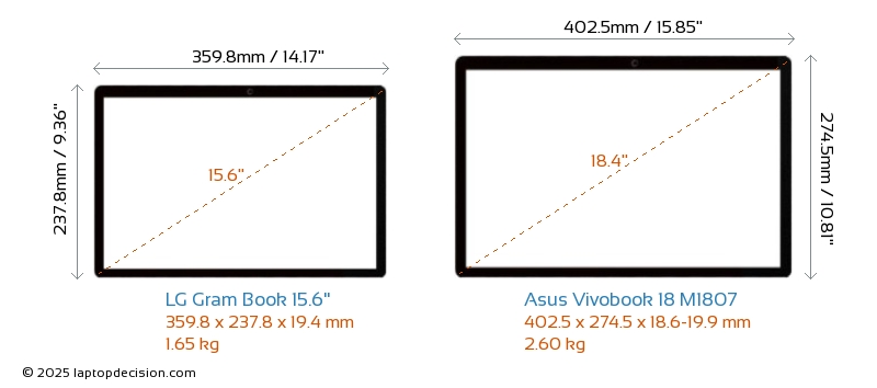 HDMIBoth Gram Book 15.6" and Vivobook 18 M1807 feature an HDMI port. Gram Book 15.6" offers 1x HDMI 1.4, while Vivobook 18 M1807 offers 1x HDMI 2.1.
