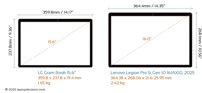 HDMIBoth Gram Book 15.6" and Legion Pro 5i Gen 10 16IAX10, 2025 feature an HDMI port. Gram Book 15.6" offers 1x HDMI 1.4, while Legion Pro 5i Gen 10 16IAX10, 2025 offers 1x HDMI 2.1.