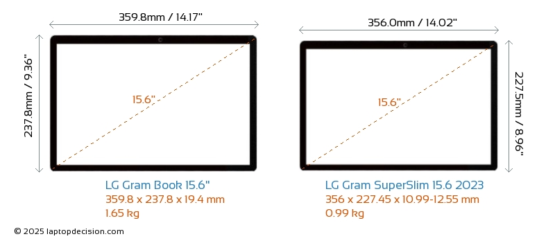 HDMI Gram Book 15.6" features an HDMI port (1x HDMI 1.4) for connecting to external monitors. Gram SuperSlim 15.6 2023 does not have an HDMI port.