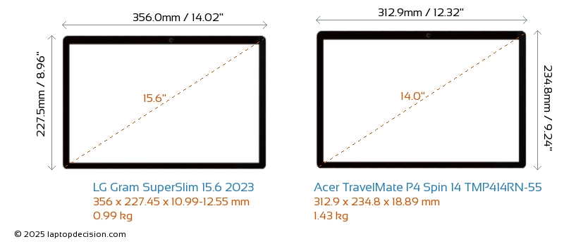 USB TravelMate P4 Spin 14 TMP414RN-55 is equipped with 2x USB 3.2 USB-A ports. Gram SuperSlim 15.6 2023 does not have USB-A ports.Both Gram SuperSlim 15.6 2023 and TravelMate P4 Spin 14 TMP414RN-55 have USB Type-C ports. Gram SuperSlim 15.6 2023 has 3x USB 4.0 USB Type-C ports, while TravelMate P4 Spin 14 TMP414RN-55 has 2x USB 4.0 USB Type-C ports.