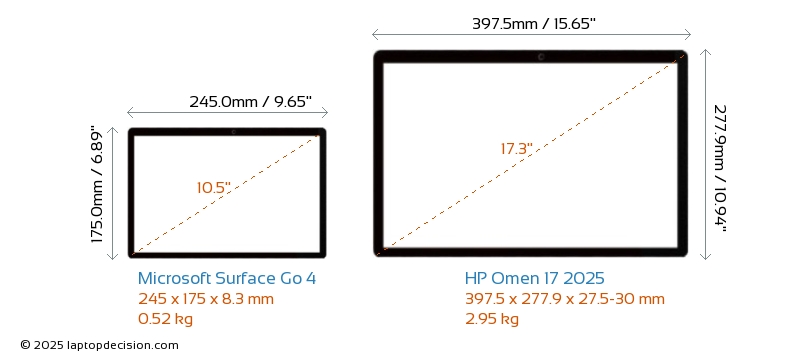 HDMI Omen 17 2025 features an HDMI port (1x HDMI 2.1) for connecting to external monitors. Surface Go 4 does not have an HDMI port.