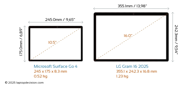 HDMI Gram 16 2025 features an HDMI port (1x HDMI 2.1) for connecting to external monitors. Surface Go 4 does not have an HDMI port.