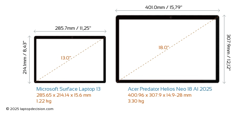 HDMI Predator Helios Neo 18 AI 2025 features an HDMI port (1x HDMI 2.1) for connecting to external monitors. Surface Laptop 13 does not have an HDMI port.