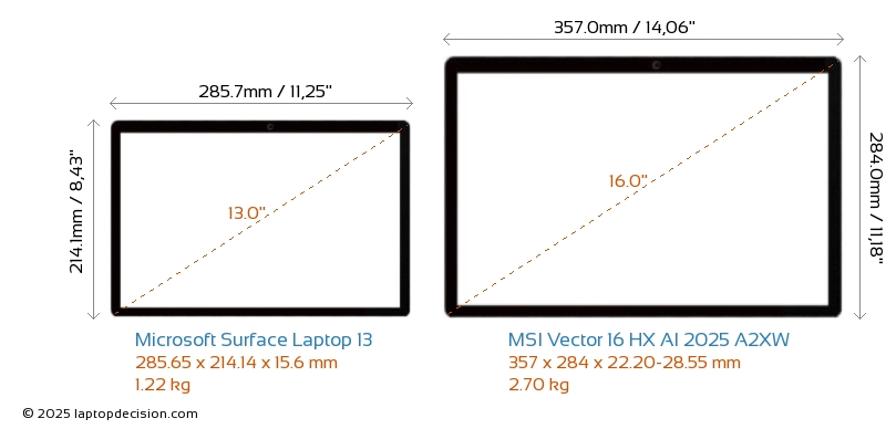 HDMI Vector 16 HX AI 2025 A2XW features an HDMI port (1x HDMI 2.1) for connecting to external monitors. Surface Laptop 13 does not have an HDMI port.