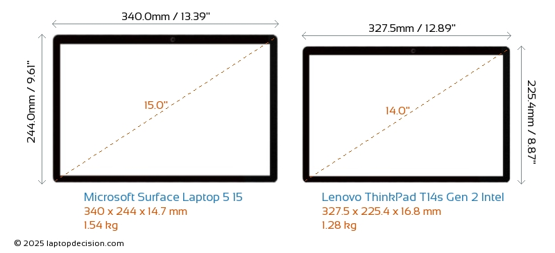 USBBoth Surface Laptop 5 15 and ThinkPad T14s Gen 2 Intel have USB-A ports. Surface Laptop 5 15 has 1x USB 3.1 USB-A ports, while ThinkPad T14s Gen 2 Intel has 2x USB 3.2 USB-A ports.Both Surface Laptop 5 15 and ThinkPad T14s Gen 2 Intel have USB Type-C ports. Surface Laptop 5 15 has 1x USB 4.0 USB Type-C ports, while ThinkPad T14s Gen 2 Intel has 2x USB 4.0 USB Type-C ports.