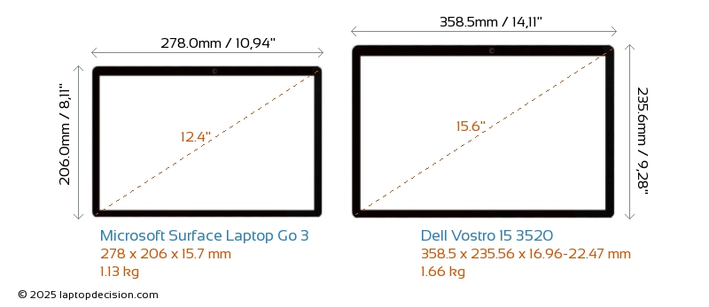 HDMI Vostro 15 3520 features an HDMI port (1x HDMI 1.4) for connecting to external monitors. Surface Laptop Go 3 does not have an HDMI port.