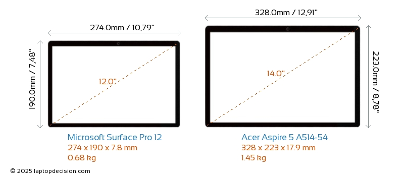 HDMIAspire 5 A514-54 features an HDMI port (1x HDMI 2.0) for connecting to external monitors. Surface Pro 12 does not have an HDMI port.