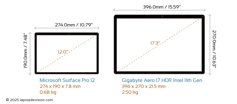 Audio JackAero 17 HDR Intel 11th Gen is equipped with a 3.5mm Audio Jack, allowing seamless connection to headphones and speakers. Surface Pro 12 does not have a 3.5mm Audio Jack.