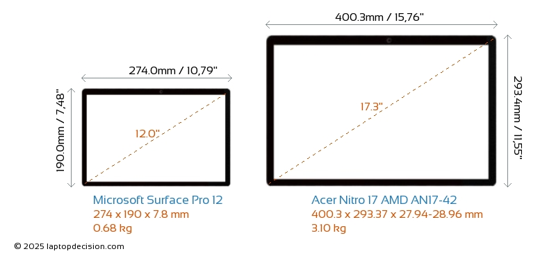 HDMI Nitro 17 AMD AN17-42 features an HDMI port (1x HDMI 2.1) for connecting to external monitors. Surface Pro 12 does not have an HDMI port.