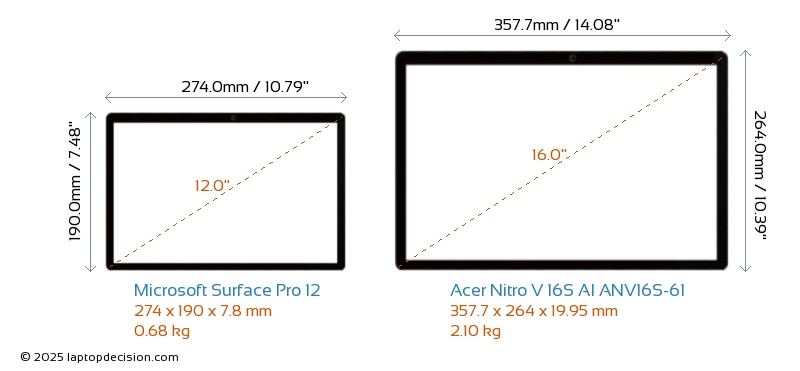 HDMI Nitro V 16S AI ANV16S-61 features an HDMI port (1x HDMI 2.1) for connecting to external monitors. Surface Pro 12 does not have an HDMI port.