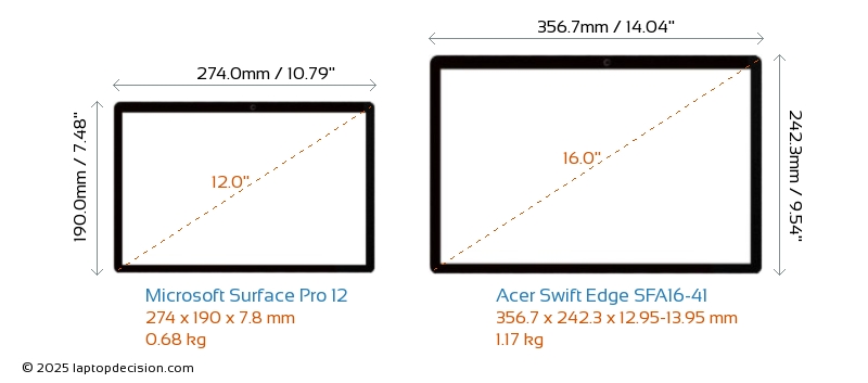 HDMI Swift Edge SFA16-41 features an HDMI port (1x HDMI 2.1) for connecting to external monitors. Surface Pro 12 does not have an HDMI port.