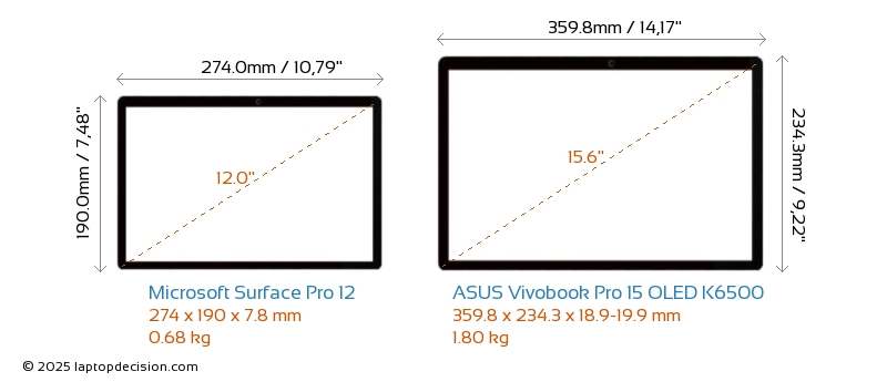 USB Vivobook Pro 15 OLED K6500 is equipped with 3x USB 3.2 USB-A ports. Surface Pro 12 does not have USB-A ports.Both Surface Pro 12 and Vivobook Pro 15 OLED K6500 have USB Type-C ports. Surface Pro 12 has 2x USB 4.0 USB Type-C ports, while Vivobook Pro 15 OLED K6500 has 1x USB 3.2 USB Type-C ports.