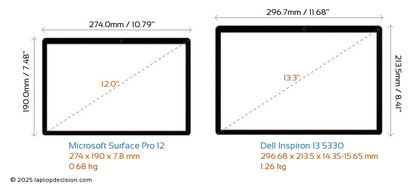 HDMI Inspiron 13 5330 features an HDMI port (1x HDMI 1.4) for connecting to external monitors. Surface Pro 12 does not have an HDMI port.