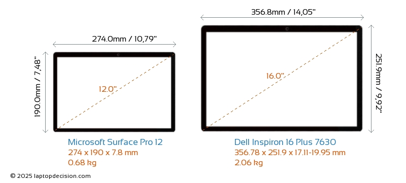 HDMI Inspiron 16 Plus 7630 features an HDMI port (1x HDMI 2.0) for connecting to external monitors. Surface Pro 12 does not have an HDMI port.