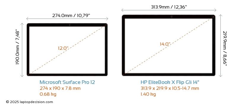 USB EliteBook X Flip G1i 14" is equipped with 1x USB 3.2 USB-A ports. Surface Pro 12 does not have USB-A ports.Both Surface Pro 12 and EliteBook X Flip G1i 14" have USB Type-C ports. Surface Pro 12 has 2x USB 4.0 USB Type-C ports, while EliteBook X Flip G1i 14" has 3x USB 4.0 USB Type-C ports.