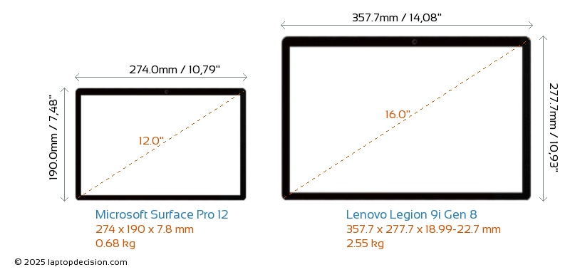 SD Card Reader Legion 9i Gen 8 is equipped with an SD Card Reader for easy access to memory cards. Surface Pro 12 does not have an SD Card Reader.