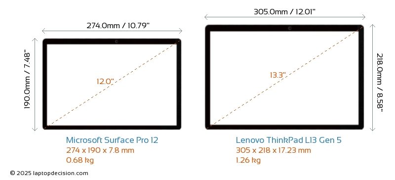 Audio Jack ThinkPad L13 Gen 5 is equipped with a 3.5mm Audio Jack, allowing seamless connection to headphones and speakers. Surface Pro 12 does not have a 3.5mm Audio Jack.