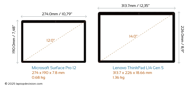 Audio Jack ThinkPad L14 Gen 5 is equipped with a 3.5mm Audio Jack, allowing seamless connection to headphones and speakers. Surface Pro 12 does not have a 3.5mm Audio Jack.