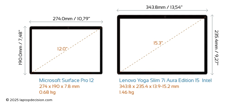 USB Yoga Slim 7i Aura Edition 15 Intel is equipped with 1x USB 3.2 USB-A ports. Surface Pro 12 does not have USB-A ports.Both Surface Pro 12 and Yoga Slim 7i Aura Edition 15 Intel feature 2x USB 4.0 USB Type-C ports.