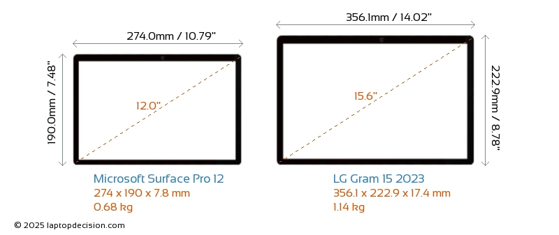 HDMI Gram 15 2023 features an HDMI port (1x HDMI 2.0) for connecting to external monitors. Surface Pro 12 does not have an HDMI port.