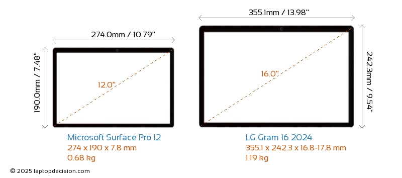 HDMI Gram 16 2024 features an HDMI port (1x HDMI 2.1) for connecting to external monitors. Surface Pro 12 does not have an HDMI port.
