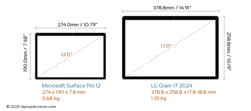 HDMI Gram 17 2024 features an HDMI port (1x HDMI 2.1) for connecting to external monitors. Surface Pro 12 does not have an HDMI port.