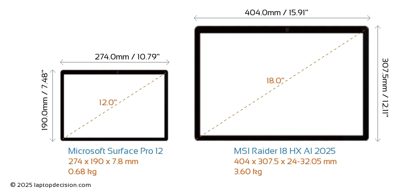 HDMI Raider 18 HX AI 2025 features an HDMI port (1x HDMI 2.1) for connecting to external monitors. Surface Pro 12 does not have an HDMI port.