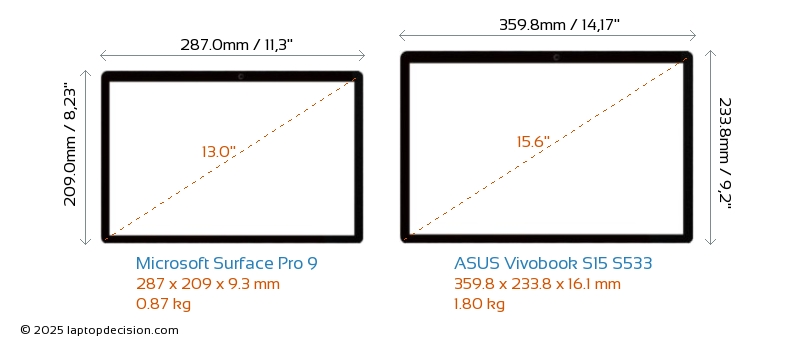 HDMIVivobook S15 S533 features an HDMI port (1x HDMI 1.4) for connecting to external monitors. Surface Pro 9 does not have an HDMI port.