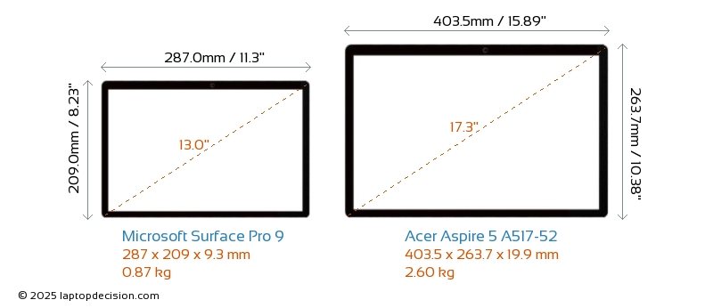 Thunderbolt Surface Pro 9 is equipped with Thunderbolt 4 port. Aspire 5 A517-52 does not have Thunderbolt port.