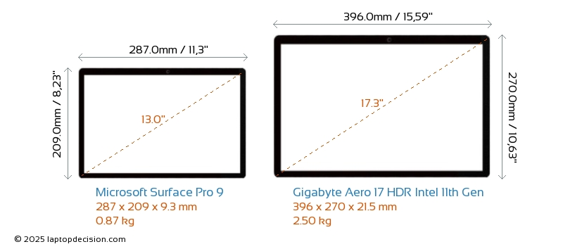 Audio JackAero 17 HDR Intel 11th Gen is equipped with a 3.5mm Audio Jack, allowing seamless connection to headphones and speakers. Surface Pro 9 does not have a 3.5mm Audio Jack.