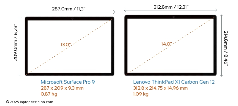 Audio Jack ThinkPad X1 Carbon Gen 12 is equipped with a 3.5mm Audio Jack, allowing seamless connection to headphones and speakers. Surface Pro 9 does not have a 3.5mm Audio Jack.