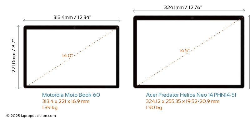 HDMIBoth Moto Book 60 and Predator Helios Neo 14 PHN14-51 feature an HDMI port. Moto Book 60 offers 1x HDMI 1.4, while Predator Helios Neo 14 PHN14-51 offers 1x HDMI 2.1.
