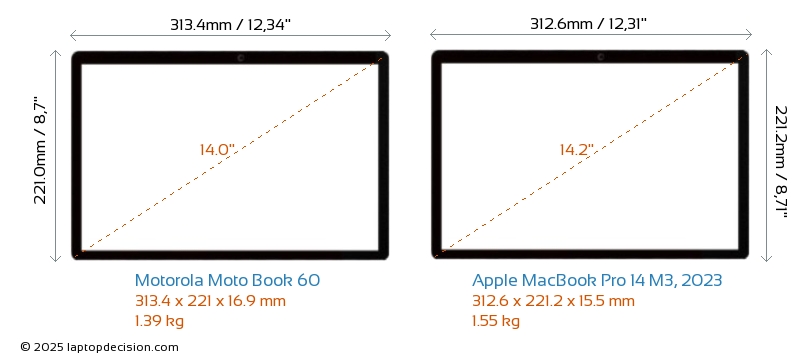 HDMIBoth Moto Book 60 and MacBook Pro 14 M3, 2023 feature an HDMI port. Moto Book 60 offers 1x HDMI 1.4, while MacBook Pro 14 M3, 2023 offers 1x HDMI 2.1.