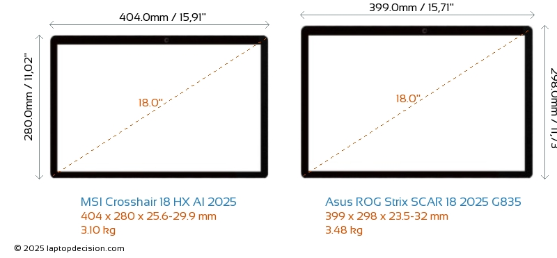 USBBoth Crosshair 18 HX AI 2025 and ROG Strix SCAR 18 2025 G835 feature 3x USB 3.2 USB-A ports.Both Crosshair 18 HX AI 2025 and ROG Strix SCAR 18 2025 G835 have USB Type-C ports. Crosshair 18 HX AI 2025 has 1x USB 3.2 USB Type-C ports, while ROG Strix SCAR 18 2025 G835 has 2x USB 4.0 USB Type-C ports.