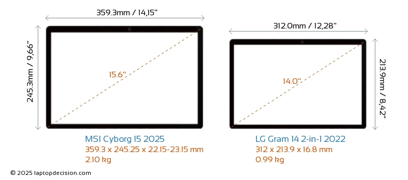 HDMIBoth Cyborg 15 2025 and Gram 14 2-in-1 2022 feature an HDMI port. Cyborg 15 2025 offers 1x HDMI 2.1, while Gram 14 2-in-1 2022 offers 1x HDMI 2.0.