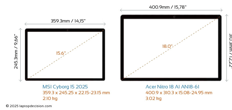 HDMIBoth Cyborg 15 2025 and Nitro 18 AI AN18-61 feature an HDMI port (1x HDMI 2.1) for connecting to external monitors.