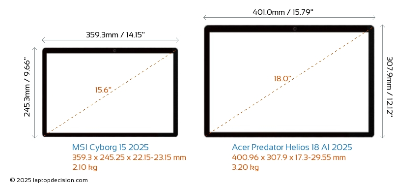 USBBoth Cyborg 15 2025 and Predator Helios 18 AI 2025 have USB-A ports. Cyborg 15 2025 has 2x USB 3.2 USB-A ports, while Predator Helios 18 AI 2025 has 3x USB 3.2 USB-A ports.Both Cyborg 15 2025 and Predator Helios 18 AI 2025 have USB Type-C ports. Cyborg 15 2025 has 1x USB 3.2 USB Type-C ports, while Predator Helios 18 AI 2025 has 2x USB 4.0 USB Type-C ports.