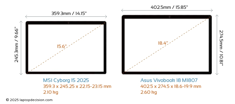 HDMIBoth Cyborg 15 2025 and Vivobook 18 M1807 feature an HDMI port (1x HDMI 2.1) for connecting to external monitors.