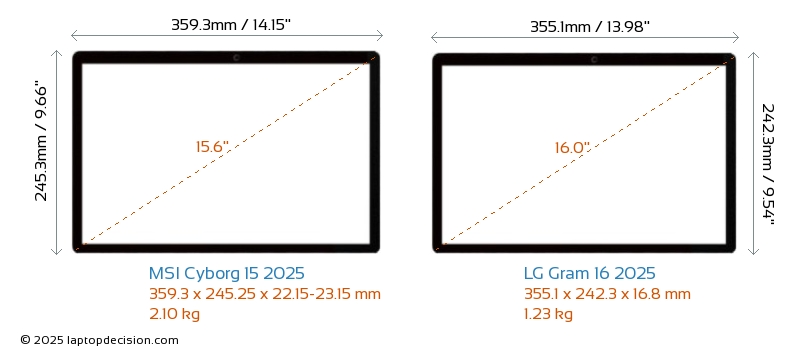 HDMIBoth Cyborg 15 2025 and Gram 16 2025 feature an HDMI port (1x HDMI 2.1) for connecting to external monitors.