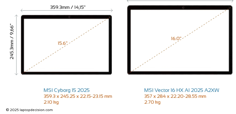 USBBoth Cyborg 15 2025 and Vector 16 HX AI 2025 A2XW feature 2x USB 3.2 USB-A ports.Both Cyborg 15 2025 and Vector 16 HX AI 2025 A2XW have USB Type-C ports. Cyborg 15 2025 has 1x USB 3.2 USB Type-C ports, while Vector 16 HX AI 2025 A2XW has 2x USB 4.0 USB Type-C ports.
