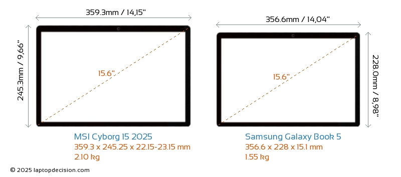 Audio JackBoth Cyborg 15 2025 and Galaxy Book 5 are equipped with a 3.5mm Audio Jack, providing seamless connection to headphones and speakers.