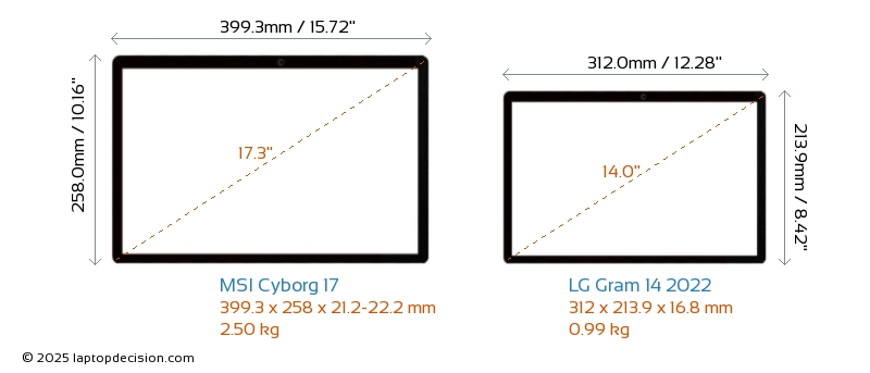 HDMIBoth Cyborg 17 and Gram 14 2022 feature an HDMI port. Cyborg 17 offers 1x HDMI 2.1, while Gram 14 2022 offers 1x HDMI 2.0.