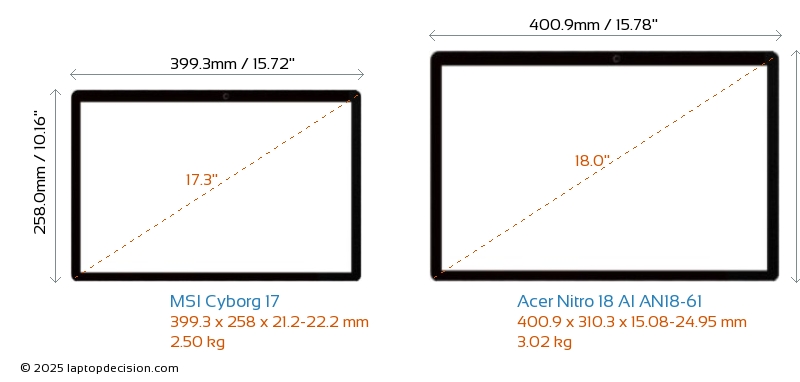 HDMIBoth Cyborg 17 and Nitro 18 AI AN18-61 feature an HDMI port (1x HDMI 2.1) for connecting to external monitors.
