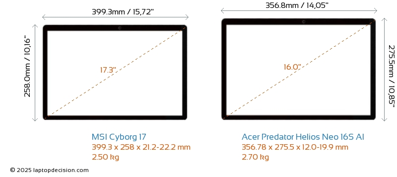HDMIBoth Cyborg 17 and Predator Helios Neo 16S AI feature an HDMI port (1x HDMI 2.1) for connecting to external monitors.