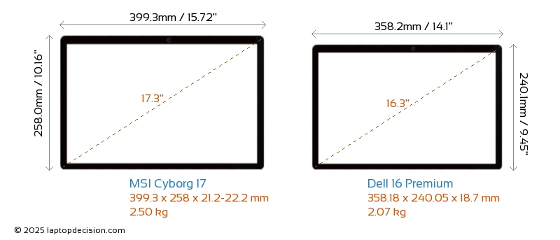HDMI Cyborg 17 features an HDMI port (1x HDMI 2.1) for connecting to external monitors. 16 Premium does not have an HDMI port.