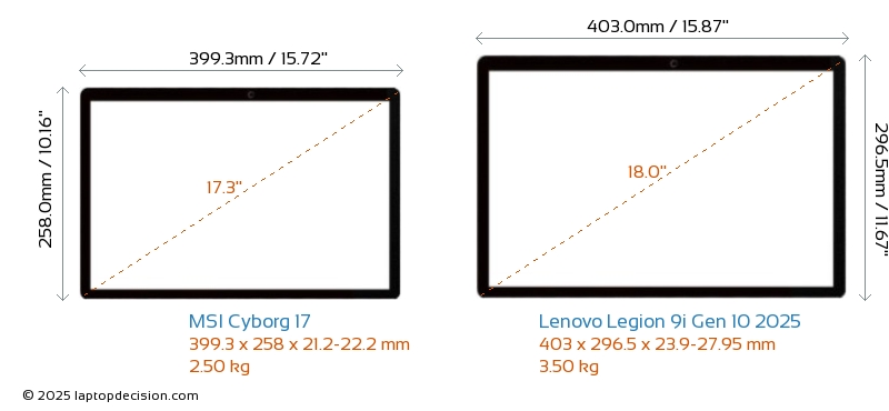 USBBoth Cyborg 17 and Legion 9i Gen 10 2025 have USB-A ports. Cyborg 17 has 2x USB 3.2 USB-A ports, while Legion 9i Gen 10 2025 has 3x USB 3.2 USB-A ports.Both Cyborg 17 and Legion 9i Gen 10 2025 have USB Type-C ports. Cyborg 17 has 1x USB 3.2 USB Type-C ports, while Legion 9i Gen 10 2025 has 3x USB 4.0 USB Type-C ports.