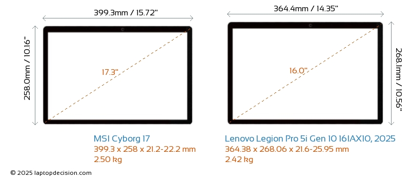 USBBoth Cyborg 17 and Legion Pro 5i Gen 10 16IAX10, 2025 have USB-A ports. Cyborg 17 has 2x USB 3.2 USB-A ports, while Legion Pro 5i Gen 10 16IAX10, 2025 has 3x USB 3.2 USB-A ports.Both Cyborg 17 and Legion Pro 5i Gen 10 16IAX10, 2025 have USB Type-C ports. Cyborg 17 has 1x USB 3.2 USB Type-C ports, while Legion Pro 5i Gen 10 16IAX10, 2025 has 2x USB 4.0 USB Type-C ports.
